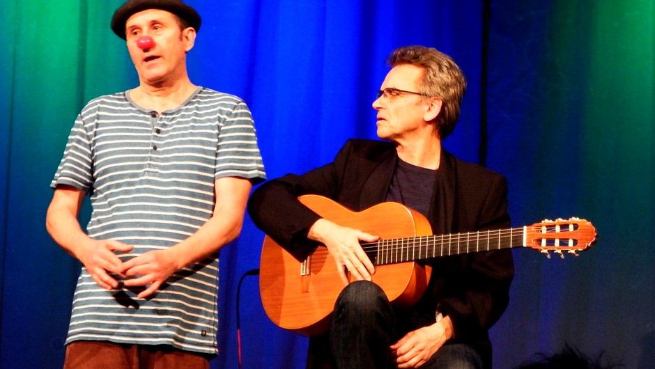 | Am Freitagabend in der Geislinger Rätsche: Die Aktion von Clown Paulo wird effektvoll unterstrichen vom virtuosen Gitarrenspiel von Dieter Mann (rechts). Auch er schlüpft zeitweise in die Rolle des Clowns, wenn er auf Paulo reagiert |